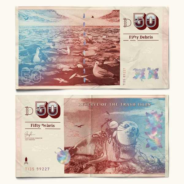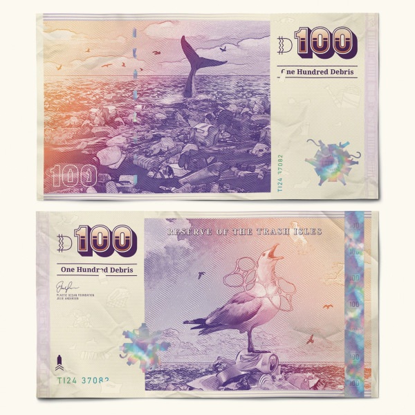 Se na União Europeia temos o euro, os cidadãos das Ilhas de Lixo têm o “detrito”. Com ilustrações de Tony Wilson, as notas mostram imagens dos oceanos devastados pelo plástico. A nota de 20 detritos mostra uma tartaruga com um resíduo plástico à volta da sua carapaça.