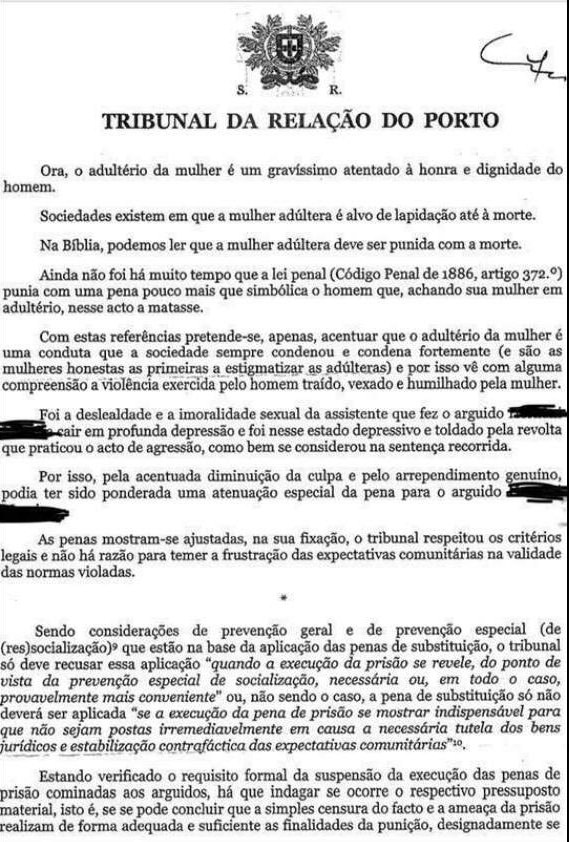 A Amnistia Internacional Portugal disse estar “preocupada” não só pela atuação dos juízes desembargadores ao “arrepio” dos preceitos legais e constitucionais, mas pelo espelhar de uma cultura e justiça promotora de “misoginia”, sem ter em conta os direitos das mulheres e à compreensão do uso de violência para vingar a honra e a dignidade. “A Amnistia Internacional Portugal defende a ausência de considerações de caráter religioso como fundamentação jurídica em nome do respeito do princípio da laicidade e em nome da igualdade e do respeito por todas as religiões”, realçou. “O Código Penal Português de 1886, citado no acórdão do tribunal da Relação do Porto, foi revogado pelo Código Penal de 1982, revisto pelo Decreto-Lei 48/95, de 15 de março. Assim, o Código Penal de 1886, citado no acórdão, não é fonte de direito português, não podendo ser utilizado pelos tribunais. A sua utilização revela a ineficácia da justiça portuguesa”.